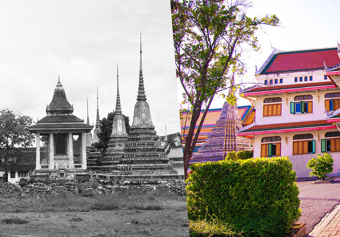 ภาพเปรียบเทียบอดีตและปัจจุบันของหมู่พระเจดีย์โบราณย่อเหลี่ยมไม้ยี่สิบ วัดอรุณราชวราราม