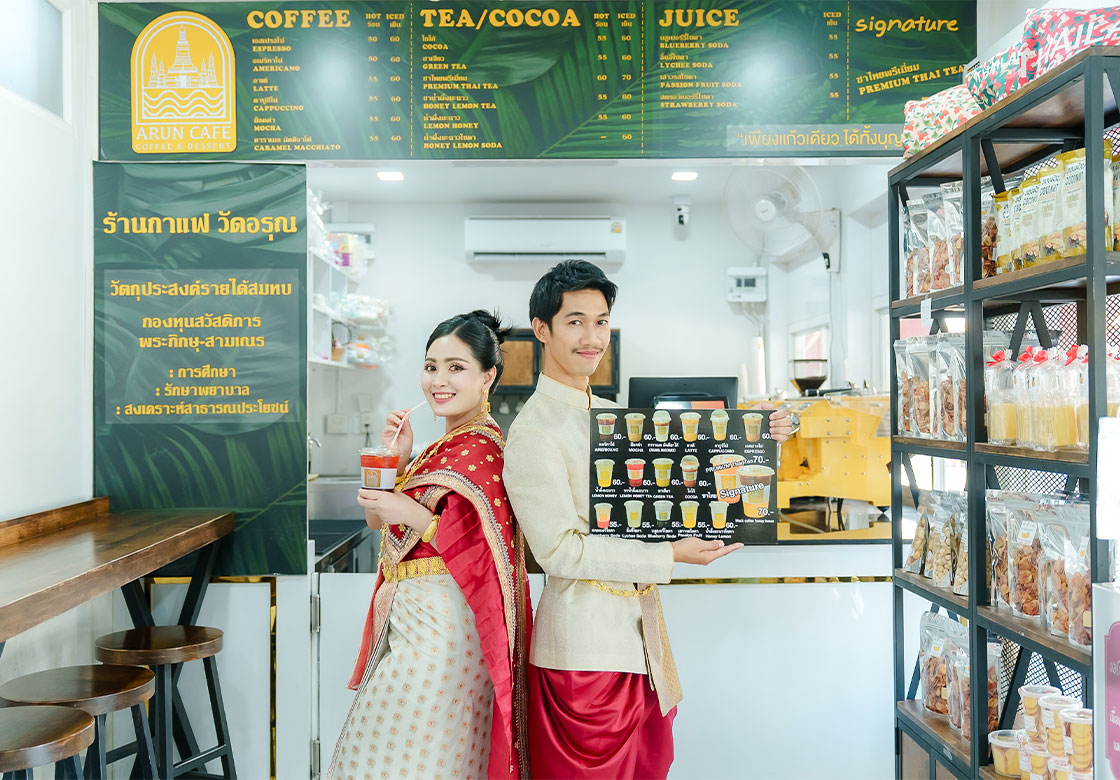 The monks of Wat Arun Ratchawararam, under the guidance of Phra Phromwatcharamethi, advisor to the Maha Thera Association and abbot of Wat Arun Ratchawararam, have initiated a welfare project through the establishment of a coffee shop named 'ARUN CAFE.'