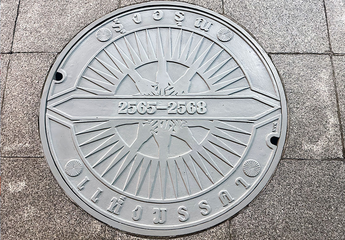 Now, the restoration project has been fully completed. As a symbol of this success, a 'dawn pin' has been installed in the middle of the road. The pin is made from durable cast metal, with design elements symbolizing unity and merit across all sectors. The trunk and palm shapes represent cooperation, while the radiating lines represent the rays of the sun at dawn. Engraved on the pin is the message 'Dawn of the Path,' along with the restoration timeline (B.E. 2565–2568).