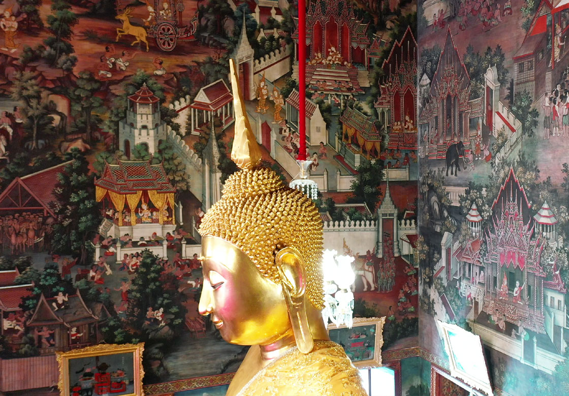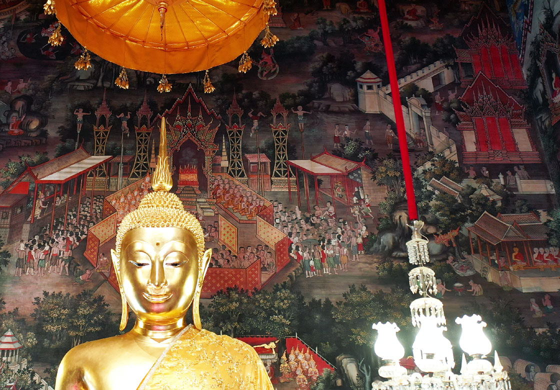 The interior of the ordination hall contains numerous ancient works of art, including murals on all four walls painted by royal artisans of the early Rattanakosin era.