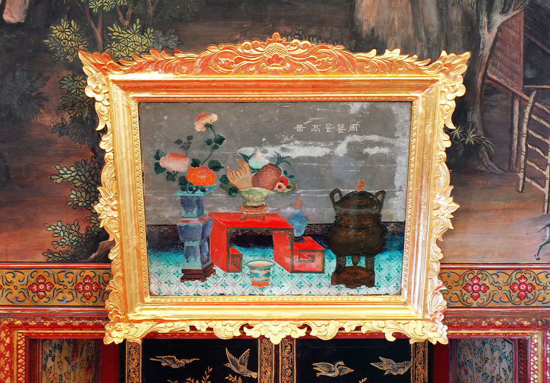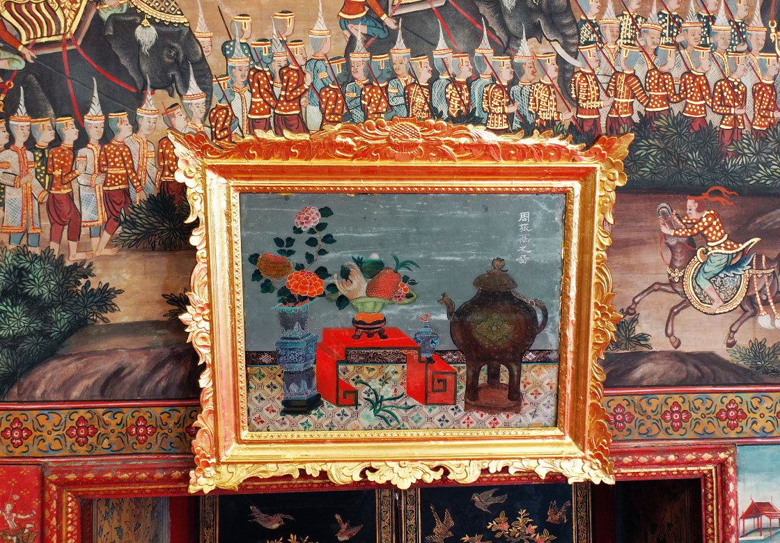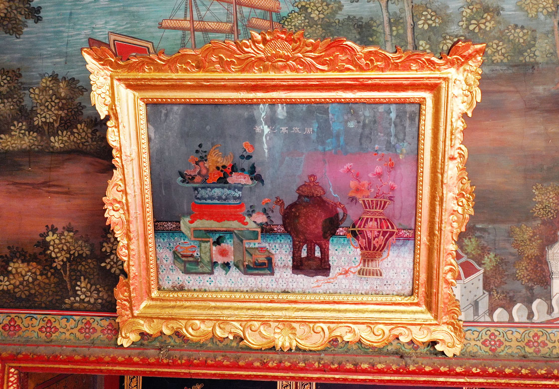 These murals include original works from the reign of King Rama III, as well as later restorations during the reign of King Rama V. Above the windows and doors are 18 framed paintings of Chinese-style offering tables with mirrors, adding further uniqueness to the hall.