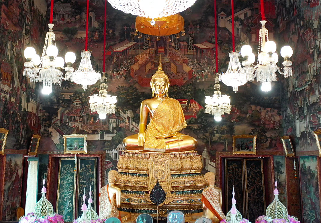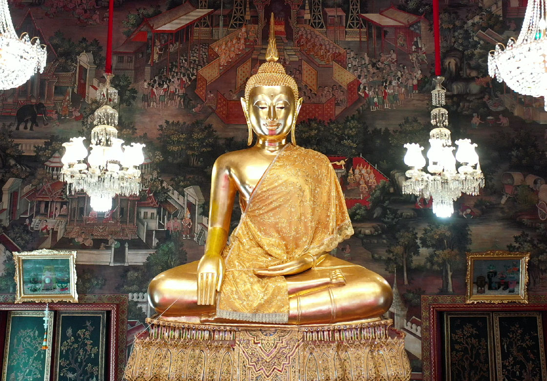 Legend holds that King Rama II himself modeled the face of this image. The Buddha is depicted in the Mara Vijaya posture, with a lap width of three cubits and one span, seated on a grand pedestal. In front of the image are two disciples facing the principal Buddha, with a royal fan (pad yot) placed between them—designating the Buddha image as equivalent to the rank of a high ecclesiastical dignitary.