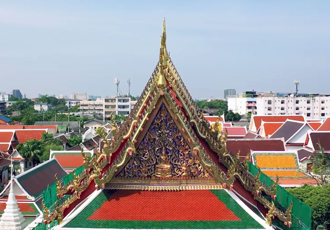 外墙镶嵌彩釉瓷片,装饰着精美的泰式藤蔓纹样。