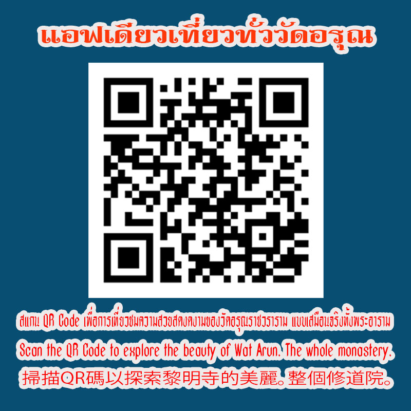 หรือจะเที่ยวชมอยู่ที่บ้านของท่านจากทั่วทุกมุมโลกโดย สแกน qr code เปิดระบบแอปพลิเคชัน แอพเดียวเที่ยวทั่ววัดอรุณ ก็สามารถทำได้ เพราะทุกๆโบราณสถานสำคัญของวัดอรุณราชวรารามนั้น ในแอปพลิเคชัน แอพเดียวเที่ยวทั่ววัดอรุณ ทุกจุดสำคัญจะมีคลิปบรรยายเล่าประวัติความเป็นมาของโบราณสถานสำคัญนั้นๆไว้อย่างละเอียดตามภาษาที่ท่านเลือก
